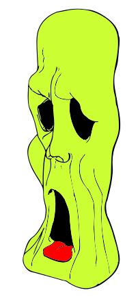 This features a cartoonish drawing of an open mouth with teeth, resembling the face of a screaming monster. This creepy character is painted in bright green and has a red tongue sticking out from its mouth. The drawing appears to be part of a colorful background that includes various shades of brown and white. The overall composition creates an interesting contrast between the vibrant colors of the monster's face and the more subdued tones of the background.
