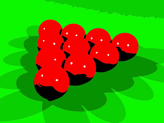 This features a group of red balls arranged in an artistic manner. There are twelve red balls in total, with some placed closer to the foreground and others further back. They appear to be floating or hovering above a grassy surface, creating a visually appealing scene. The arrangement of these balls gives off a sense of depth and dimension, making it an interesting and unique composition.