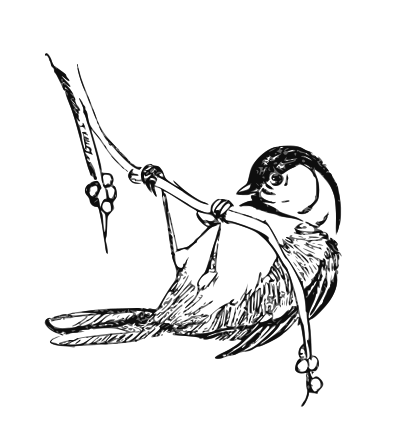 This features a black and white drawing of a bird, possibly a robin or a black-capped chickadee. The bird is captured in mid-air, with its wings spread out as it appears to be flying through the air. It has a somewhat sad expression on its face, giving the impression that it might be struggling to fly. The drawing showcases the bird's wings and tail feathers, providing a detailed view of its anatomy.