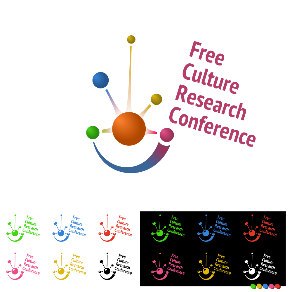 This is a white background with a colorful logo that reads "Free Culture Research Conference." The logo features a circle with four dots, each representing different colors. These colors are blue, green, orange, and yellow. The dots are arranged in such a way that they form the word "culture" within the circle. This design is visually appealing and inviting for potential participants of the conference.