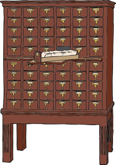 This is a cartoon drawing of an old wooden filing cabinet with a brown color scheme. It features several drawers, each containing multiple compartments for storing items. A box is placed on top of the cabinet, adding to its vintage appearance. The overall design gives off a nostalgic and classic feel, reminiscent of older times when such cabinets were commonly used in libraries or offices.