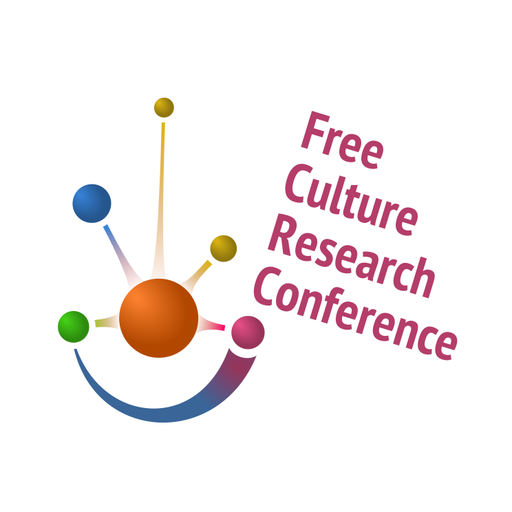 This features a colorful logo for the Free Culture Research Conference. The logo is composed of various circles, each containing different colors and symbols representing the conference's theme. There are five distinct circles in total, with one located at the top left corner, another at the bottom left, and three more positioned around the center of the image. The colorful design of the logo suggests a vibrant atmosphere for the conference, which is likely focused on promoting free culture and its importance in today's society. The use of circles and different colors creates an eye-catching visual that can easily capture the attention of potential attendees or supporters of the event.