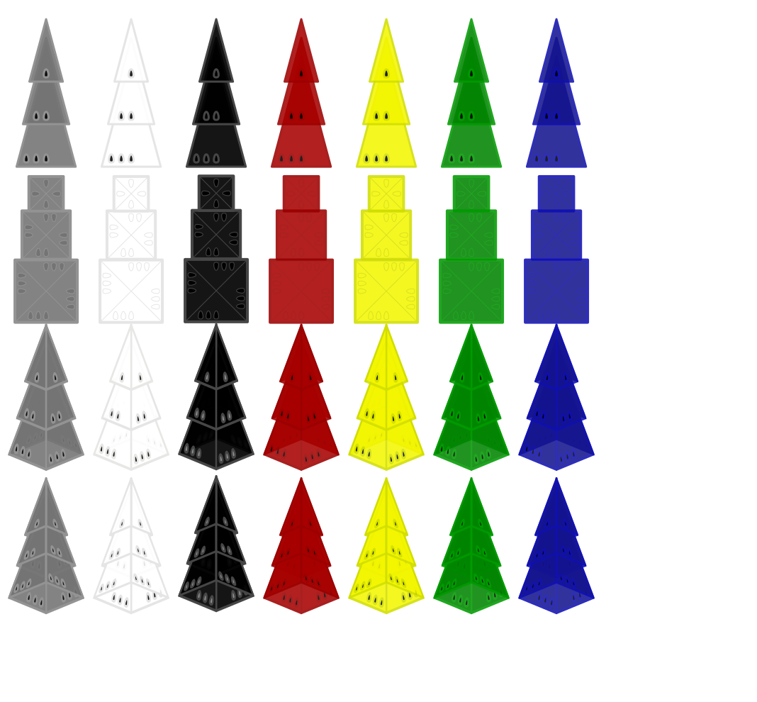 This displays a collection of various colored icehouse pyramids, each with different heights and colors. There are 13 distinctly visible icehouses in the scene, arranged in rows on a white background. These icehouses come in a variety of colors such as red, yellow, blue, green, black, and gray. The arrangement creates an interesting visual effect, showcasing the different shapes and sizes of these unique structures.
