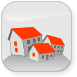 This features a square icon with three red and white houses on top of each other. Each house has an orange roof, giving the scene a vibrant appearance. The houses are positioned in such a way that they appear to be stacked on top of one another, creating a unique visual effect. This icon could potentially represent a real estate or housing app, as it showcases multiple homes in a compact and appealing manner.
