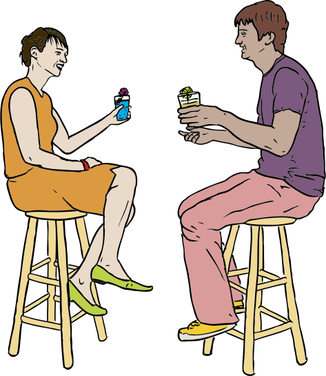 This features a man and woman sitting on stools, each holding a drink with an umbrella in it. They are engaged in conversation while enjoying their beverages. The woman is wearing a dress, and the man has pink pants. Both individuals appear to be smiling as they converse. There is also a chair visible in the scene, located near the left side of the image.