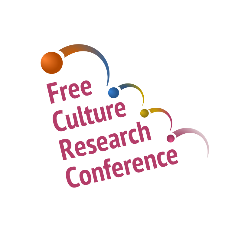 This features a logo for the Free Culture Research Conference. The logo is composed of several circles, each containing different colors and shapes. These circles are arranged in a way that they form an arc or circle shape, with some circles overlapping others. The logo's design gives it a visually appealing appearance while also conveying its purpose as the Free Culture Research Conference logo.