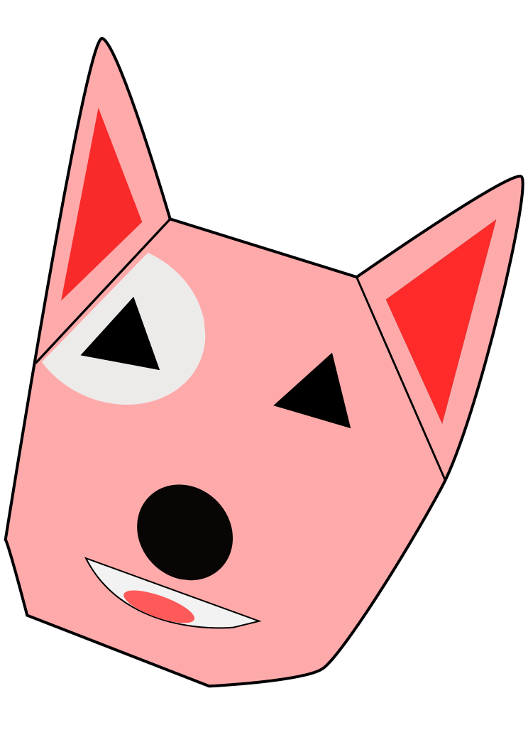 This features a pink dog with a black nose and mouth, giving it an angry appearance. It has two large eyes, one on the left side of its face and another on the right side. The dog's ears are pointed upwards, adding to its unique look. This cartoon-like dog is likely a bull terrier, as indicated by its distinctive features.