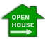 This features a green house with a white roof, and the words "Open House" written on it. A green arrow is pointing to the right, indicating that this is an open house event. The house appears to be a two-story structure, giving it a cozy and inviting appearance. This real estate clip art could be used for promoting open houses or advertising properties for sale.