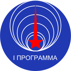 This features a blue and red logo that is shaped like a star. The star has a long red line running through it, giving the impression of a rocket or missile. The logo appears to be an emblem for a television channel, possibly representing the first channel of Soviet television. The colors used in this logo are bold and eye-catching, making it stand out as a unique symbol.
