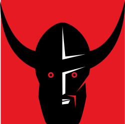 This features a red background with a black and white design of a horned head. This unique design resembles the face of a bull or a warrior, giving it an intimidating appearance. The intricate details on the horns add to its striking visual appeal. Overall, this artistic piece creates a bold and captivating image that stands out against the red background.