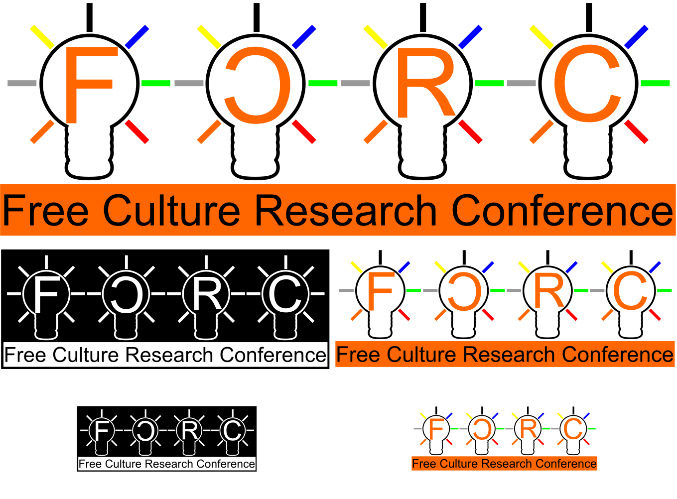 This is a poster advertising the Free Culture Research Conference. It features an orange and white logo that says "Free Culture Research Conference" in bold letters. Below this, there are six smaller logos with different colored lights around them, each one saying "free culture research conference." These logos are arranged in a row, creating a visually appealing design for the poster. The overall theme of the poster is focused on promoting the upcoming conference and its goals related to free culture research.