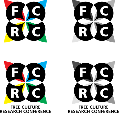 This features four different colored circles, each containing a logo for the Free Culture Research Conference. These logos are designed to represent the conference and its goals of promoting free culture research. Each circle is distinct in color, with one being red, green, blue, yellow, and white; another featuring red, green, blue, yellow, and black; a third having red, green, blue, yellow, and gray; and the fourth being red, green, blue, yellow, and white. The logos are arranged in a square formation, with each circle occupying one of the four corners.