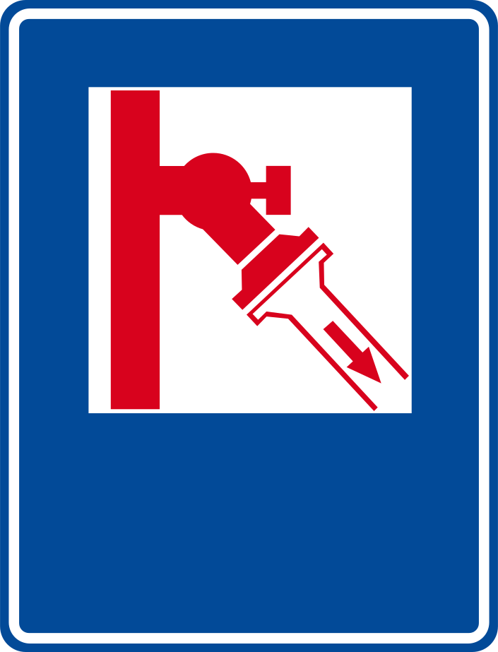 This features a blue sign with an illustration of a fire hydrant on it. The fire hydrant is shown in red and white colors, making it stand out against the blue background. The sign appears to be a street or road sign, possibly indicating the location of a nearby fire hydrant for emergency services. The design of the sign is simple yet effective at conveying its message to passersby.