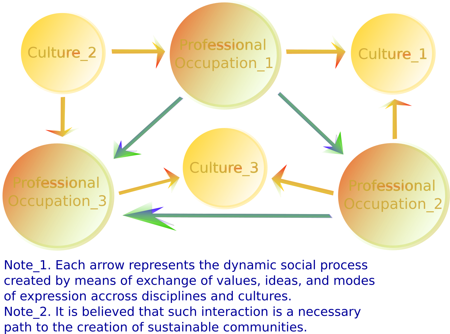 This depicts a diagram that illustrates the relationship between culture, professional occupation, and social interaction. It is divided into three main sections: Culture, Professional Occupation, and Social Interaction. Each section has its own circle, with arrows pointing to the other two sections. The diagram suggests that these three elements are interconnected and influence each other in various ways. The first section, Culture, includes sub-sections such as Values, Ideas, and Modes. These sub-sections further elaborate on the dynamics of culture within a community. The second section, Professional Occupation, is represented by several circles that highlight different professions and their roles in society. Lastly, the third section, Social Interaction, showcases how people interact with one another through various means such as exchange of values, ideas, and modes. This diagram provides an overview of the complex relationships between these three elements and emphasizes the importance of understanding them to foster sustainable communities.