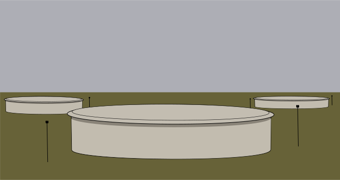 This features a large, empty swimming pool with a dome-shaped top. It is situated in an open area surrounded by grass and appears to be the central focus of the scene. There are four smaller pools located around the main one, each varying in size and positioned at different angles relative to the main pool. These smaller pools seem to be part of a larger outdoor swimming complex or recreational space. The overall atmosphere suggests a peaceful and inviting environment for relaxation and leisure activities.
