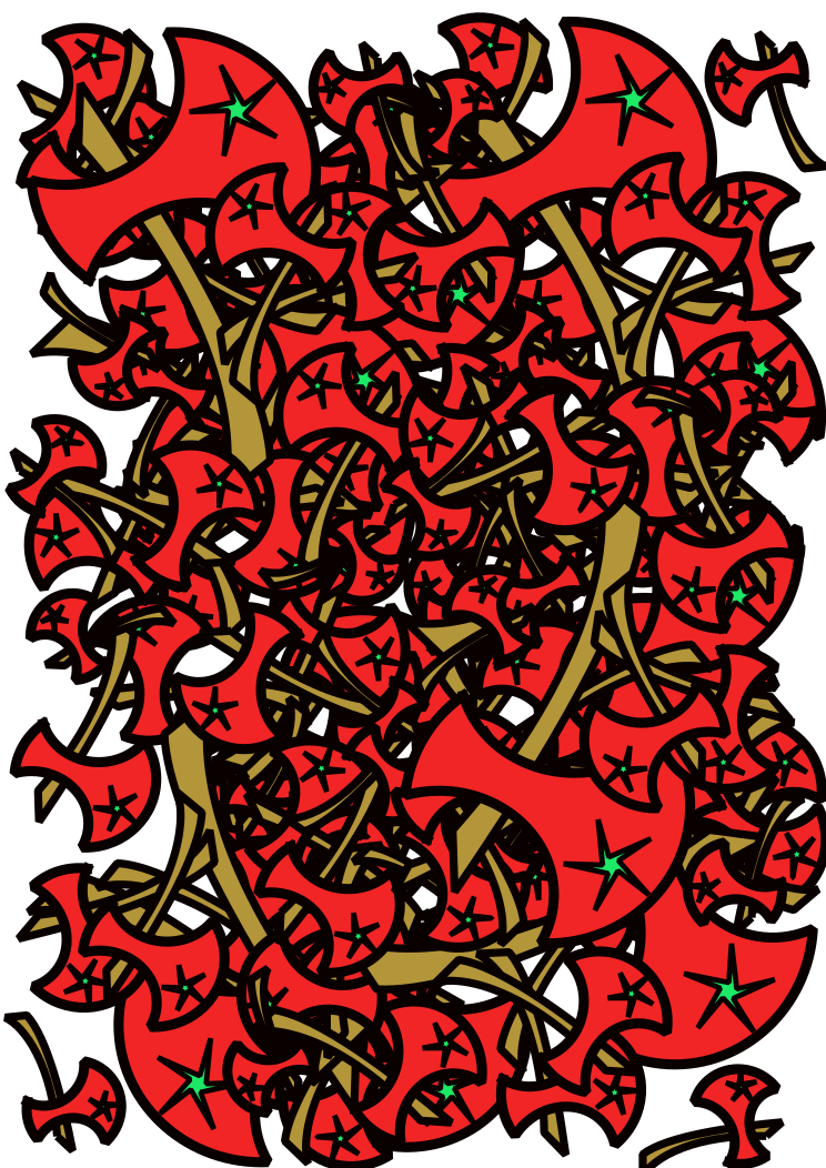 This features a vibrant and colorful design, consisting of numerous red and gold swords or axes. These swords are arranged in various positions throughout the scene, creating an intricate pattern that fills the entire frame. Some of the swords are placed closer to the foreground while others extend towards the background, giving the impression of depth and dimension to the artwork. The combination of red and gold colors adds a sense of warmth and richness to the overall design, making it visually appealing and captivating.