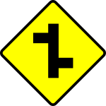 This features a yellow sign with a black cross on it. The sign is shaped like a diamond and has the word "T" written in black on it, possibly indicating a turn or directional guidance for drivers. The combination of the yellow background and the black cross creates an eye-catching contrast that makes the sign stand out against its surroundings.