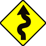 This features a yellow and black sign with an arrow pointing upwards, indicating that the road ahead is winding. This cautionary sign is placed on a white background to ensure visibility for drivers. The sign's design is simple yet effective in communicating its message to motorists, helping them navigate safely through the winding roads.