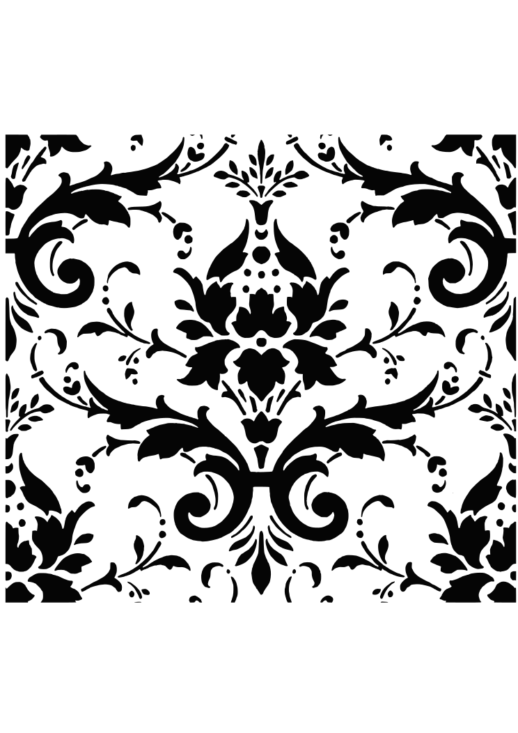 This features a black and white design with an intricate pattern of leaves, flowers, and swirls. The design is composed of various shapes, including squares, which are interconnected to create the overall composition. The patterns within each shape add depth and complexity to the design, making it visually appealing. This artistic piece could be used as a decorative element in a room or as an interesting pattern for clothing or other accessories.