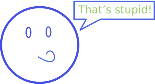 This features a blue circle with a smiley face drawn on it, accompanied by the words "That's stupid!" written in green. This illustration is likely meant to convey a negative or sarcastic message towards someone who has made an error or expressed an unpopular opinion. The use of a cartoon character and bold text adds a playful and humorous tone to the image, which could be used for various purposes such as sharing on social media platforms or in educational settings to encourage open dialogue about mistakes and learning from them.