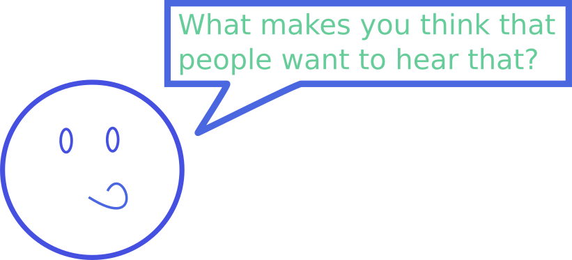 This features a cartoon character with a blue circle head, which is talking and asking the question "What makes you think that people want to hear that?" This character appears to be engaged in a conversation or discussion. The background of the image is a plain white color, providing a clean and simple backdrop for the character's speech bubble.
