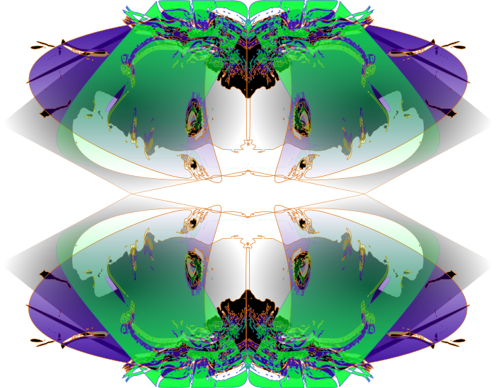This is a colorful, abstract art piece that features a reflection of a person's face. This face appears to be distorted and warped, giving the impression of multiple faces in one. The colors used are predominantly green and purple, creating an interesting visual effect. The overall composition of the image showcases the artist's creativity and skill in manipulating shapes and colors to create a unique and intriguing piece of art.