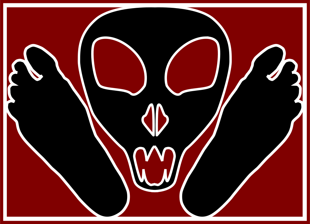This features a red background with two large, black and white alien-like feet prominently displayed. These feet are positioned in the center of the scene, taking up most of the space. In addition to the feet, there is an eye design on each foot, adding a unique touch to the overall appearance. The image has a somewhat eerie or mysterious vibe due to the combination of the alien-like feet and the red background.