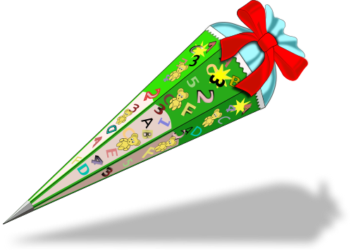 This features a colorful, multi-layered cake with a bow on top. It is decorated with various letters and numbers, making it an interesting and unique design. The cake appears to be a gift for children, possibly for starting school in Germany. The combination of the cake's layers and the creative decoration make it an appealing and eye-catching dessert.
