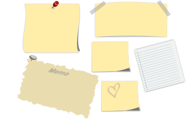 This features a collection of various papers and notes, including memo paper with the word "memo" written on it. There are also several pieces of yellow sticky note paper scattered throughout the scene. A book is visible in the background, adding to the assortment of items present in this setting.