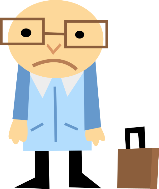 This features a cartoon character, an older man with glasses and a blue suit. He is standing next to a briefcase, giving the impression of being ready for work or business. The man appears to be frowning, possibly indicating that he is not in a happy mood. The scene has a white background, which helps to emphasize the character's features and attire.