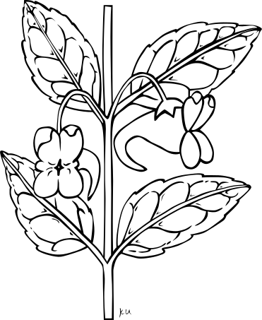 This features a black and white drawing of a leafy plant with several flowers. There are three distinct flowers visible in the drawing, each at different positions on the plant. One flower is located near the top left corner, another one is situated towards the center-left side, and the third one can be found closer to the bottom right corner. The drawing also includes a stem that connects these flowers to the main plant, giving it an artistic and detailed appearance.