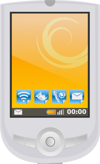 This features a cell phone with an app screen displaying several icons. These icons include a clock, a mailbox, and a telephone. There is also a Wi-Fi icon present on the screen. The phone's background has a swirl design that adds to its modern appearance. The device appears to be white in color, making it stand out against the backdrop of the image.