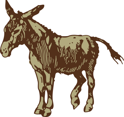 This features a brown donkey standing on all four legs. It appears to be an old drawing, possibly from the 19th century, and is depicted in black and white. The donkey's body is large and occupies most of the frame, with its head positioned towards the left side of the image. The drawing captures the essence of a donkey, showcasing its unique features and characteristics.