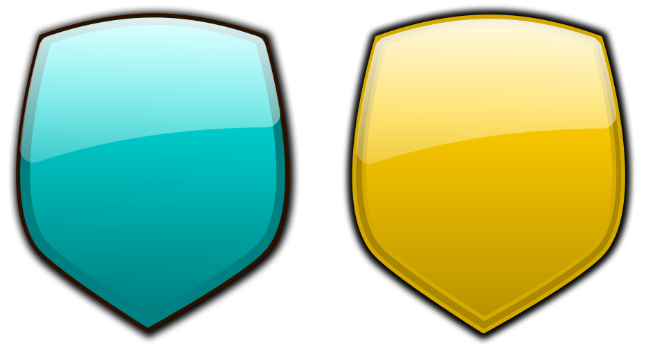 This features two shields, one blue and the other yellow. They are both placed side by side on a white background. These shields have a shiny appearance, giving them an elegant look. The blue shield is larger than the yellow one, covering more of the background. The yellow shield is smaller in size compared to the blue one but still stands out due to its vibrant color. Overall, the image showcases two distinctive and visually appealing shields.