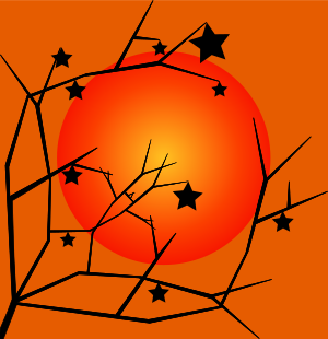 This features a beautiful orange sunset with the sun surrounded by stars. The sun is positioned in the center of the scene, and its warm glow illuminates the sky. The background consists of a tree branch with several stars scattered throughout it, adding to the overall celestial atmosphere. The combination of the sun's rays and the starry backdrop creates an enchanting and serene visual experience.