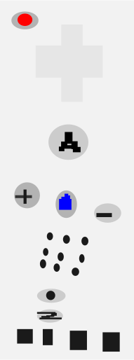 This features a close-up of a video game controller, specifically an Nintendo Wii remote. The controller has several buttons and a directional pad on it, which are essential for playing games. There is also a red button located at the top left corner of the controller. In addition to these controls, there are two small circles placed near the bottom right side of the controller, possibly indicating additional functions or features. Overall, this image showcases an up-close view of a typical video game remote control.