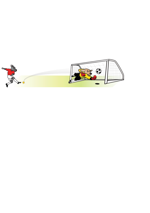 This features a cartoon dog soccer player in action, running towards the goal with a sports ball. The dog is positioned on the left side of the scene and appears to be kicking the ball as it approaches the goal. A soccer net can be seen in the background, indicating that this is indeed a soccer game. Additionally, there are two other people present in the image, one located near the top right corner and another at the bottom left corner. These figures might be teammates or opponents of the dog player.