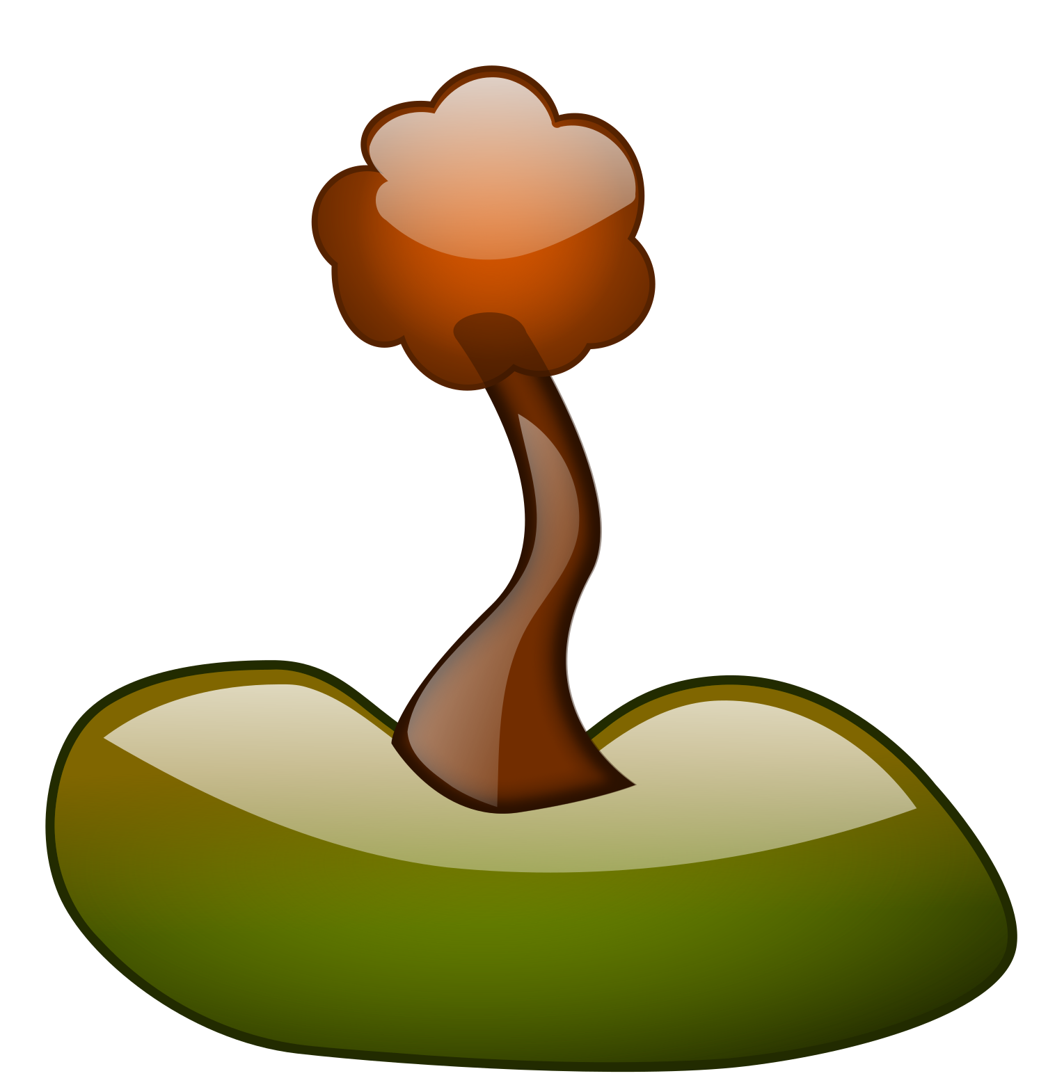 This features a cartoon-like tree with a large trunk and several branches. It is depicted in a green, brown, and orange color scheme, giving it a vibrant appearance. The tree is situated on top of a small mound or platform, which adds an interesting visual element to the scene. This creative representation of a tree can be appreciated for its artistic qualities and unique design.
