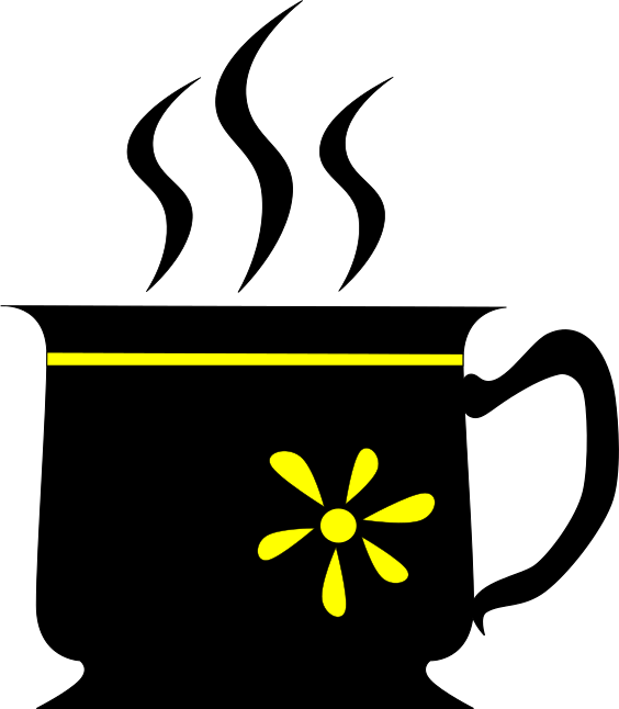 This features a black and yellow coffee mug with steam coming out of it. The mug is filled to the brim, giving an impression of being full of hot coffee. The steam is rising from the top of the cup, creating a visual representation of the coffee brewing process. This illustration captures the essence of enjoying a warm beverage in a cozy setting.