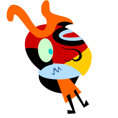 This features a colorful cartoon character with an orange body and red wings. It appears to be a humorous or whimsical design, possibly inspired by Joan Miró's artwork. The character is wearing glasses and has a mouth that seems to be open in surprise or amusement. The overall composition of the image creates a playful atmosphere, with the cartoon character taking up most of the frame.