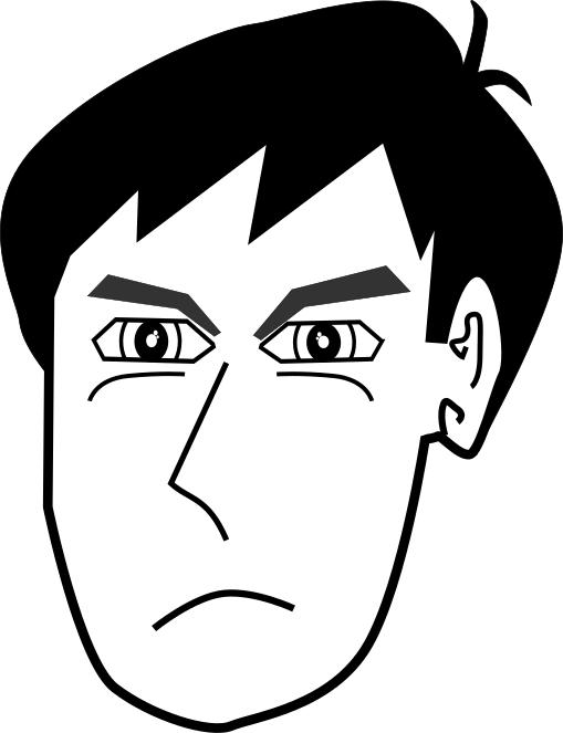 This features a black and white drawing of a man's face with a frowning expression. He has dark eyes, and his mouth is slightly open as if he is pouting or making an angry face. The drawing appears to be a cartoon-like representation of the man's facial features, giving it a unique and artistic appearance.