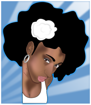 This features a woman with dark hair and a white flower in her hair. She is wearing a white top, which accentuates the contrast between her skin tone and the color of her outfit. Her expression appears to be serious as she looks directly at the camera. The overall appearance of the woman suggests that she might be a cartoon or an animated character, given the vibrant colors and unique style of her hair accessory.
