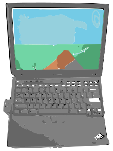 This features a laptop computer with its keyboard and screen visible. The laptop is open, displaying a colorful scene on the screen. The keyboard appears to be slightly worn out, giving it an aged appearance. The laptop's screen displays a cartoon-like image of a mountain, adding a playful touch to the device. Overall, the image showcases a close-up view of a laptop computer with its unique and colorful display.