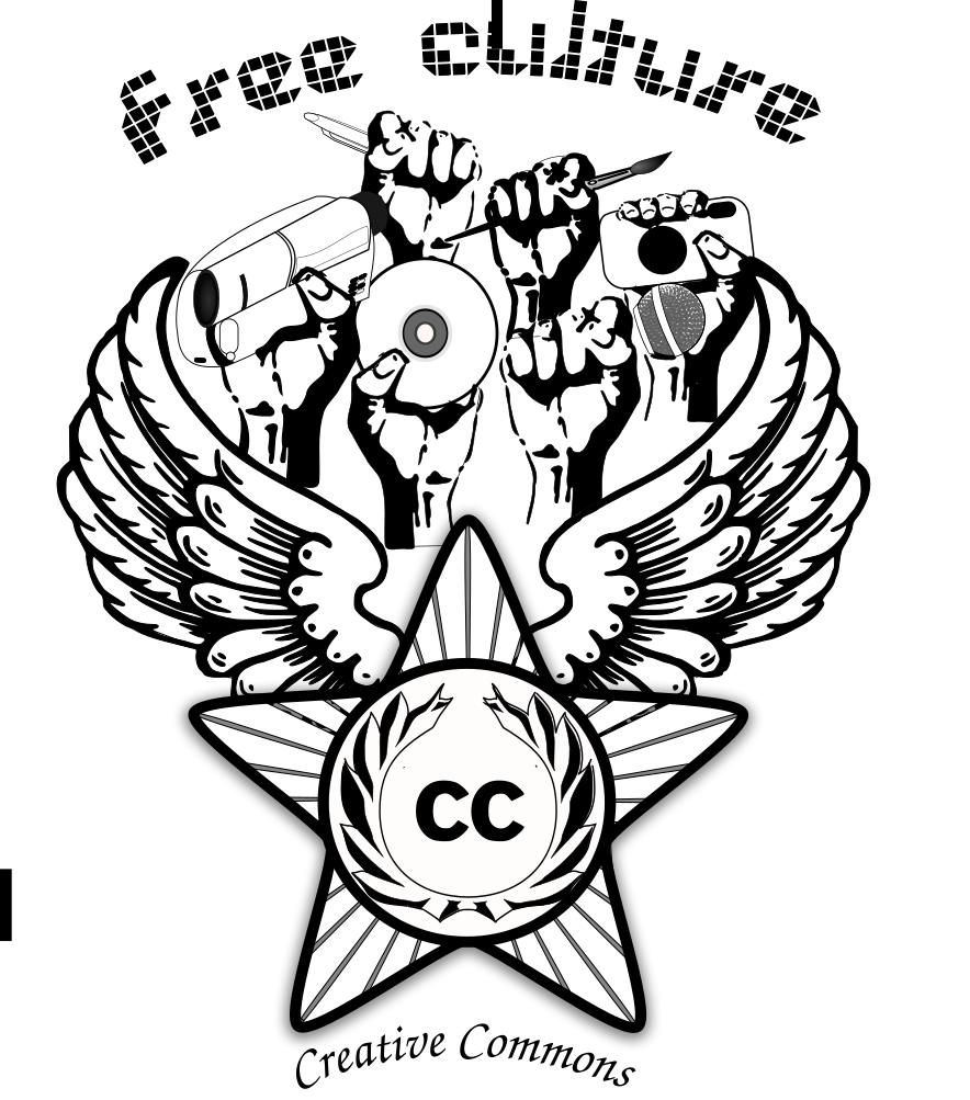 This features a logo for Free Culture, which is an organization dedicated to promoting and protecting the rights of creators. The logo consists of a star with wings on it, surrounded by various symbols representing different aspects of culture. In the center of the logo, there is a circle that says "CC" in bold letters. This symbolizes the Creative Commons movement, which seeks to provide a legal framework for sharing and using creative works without having to worry about copyright issues. The image conveys a sense of freedom and openness, as it encourages people to engage with and contribute to different aspects of culture.
