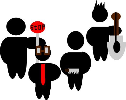 This features a group of four black and white silhouettes, each with different poses. One person is holding a stop sign, while another has a tie on. A third figure appears to be holding an instrument, possibly a violin or guitar. The fourth silhouette seems to be wearing a suitcase. These figures are arranged in a row, creating a visually interesting composition. The contrast between the black and white colors of the silhouettes adds depth and intrigue to the scene. Overall, it is an artistic representation of various everyday objects and people.