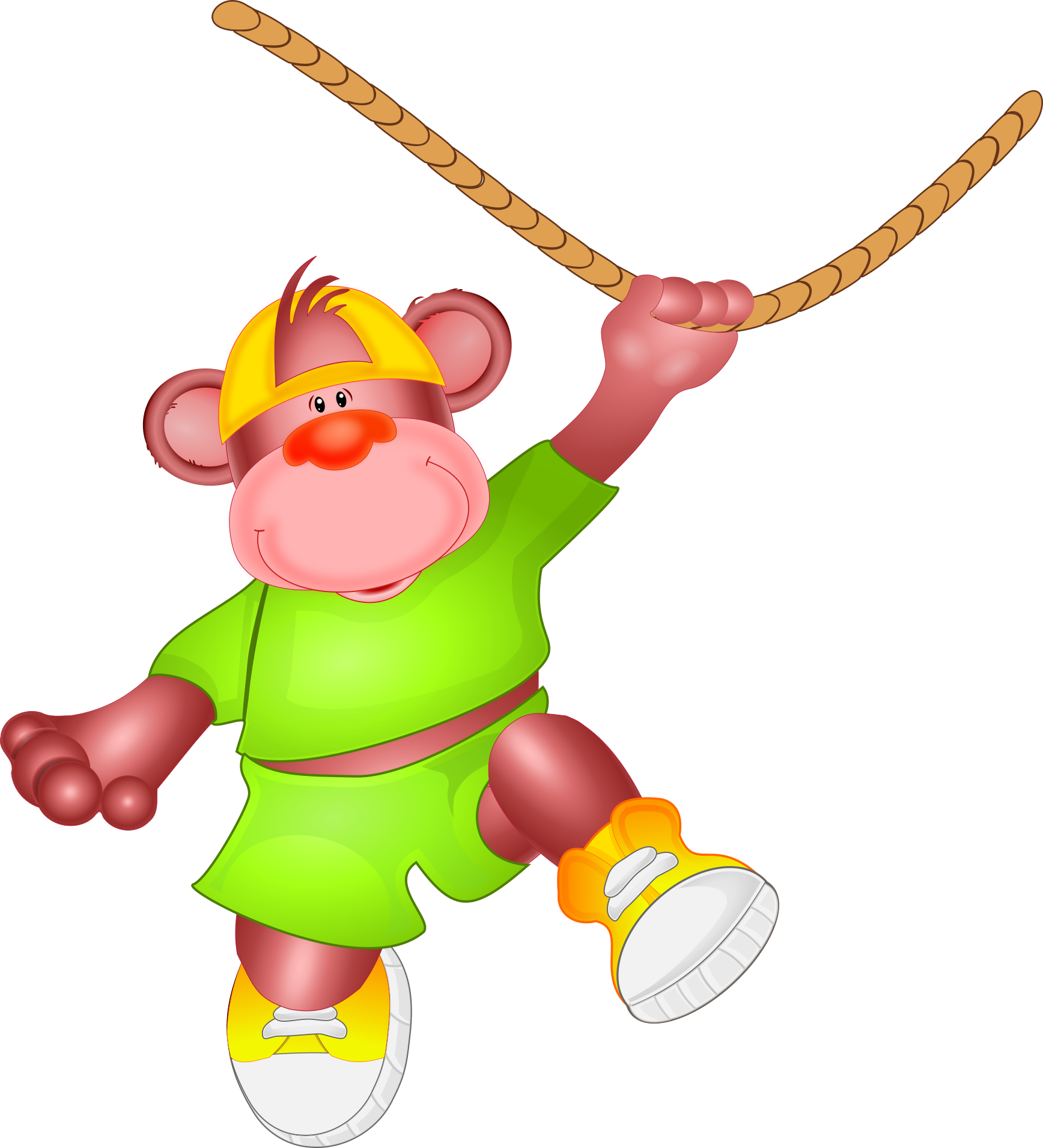 This features a cartoon monkey wearing a green shirt and yellow shoes. It appears to be in mid-air, possibly swinging from a rope or hanging on a string. The monkey's outfit is colorful and adds a playful touch to the scene. The overall atmosphere of the image suggests an imaginative and fun setting where the monkey is enjoying its time.
