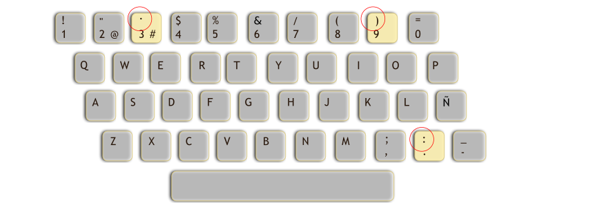 This displays a close-up of an old computer keyboard with yellow keys. The keyboard is laid out in rows, and the keys are arranged in a way that resembles a Spanish layout. There are several numbers on the keyboard, including 1, 2, 3, 4, 5, 6, 7, 8, 9, and 0. Additionally, there is an arrow key located towards the top of the keyboard. The keys are arranged in a way that makes it easy to identify each individual button, providing a clear view of the layout for anyone using this particular keyboard.