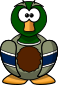 This features a cartoon duck with green and brown colors. It is wearing a vest, which adds to its cute appearance. The duck has a large brown ball in its stomach, giving it a unique and playful look. Its beady eyes are open wide, making the character appear friendly and inviting. Overall, this cartoon duck is an adorable and charming addition to any collection or display.