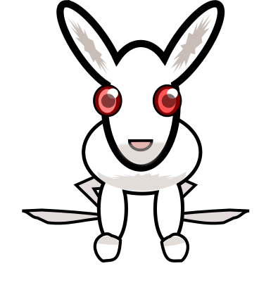 This features a white rabbit with red eyes and a smile on its face. It appears to be sitting down, possibly in an animated or cartoon-like style. The rabbit's facial expression gives it a friendly and playful appearance. The overall design of the rabbit is simple yet captivating, making it an interesting focal point for viewers.