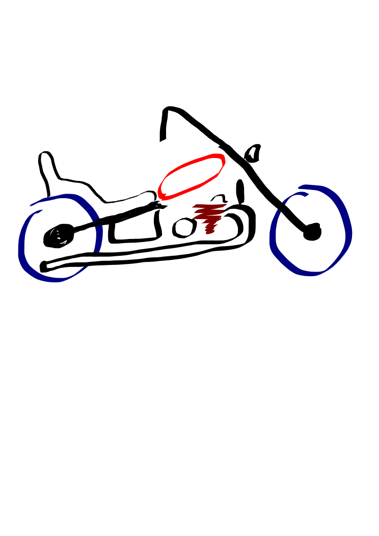 This features a hand drawn motorcycle with a red seat and blue wheels. It is an artistic representation of the motorcycle, giving it a unique appearance. The drawing captures the essence of the motorcycle, showcasing its design elements such as the handlebars, tires, and other components. This creative piece can be appreciated for its attention to detail and the artist's ability to bring the motorcycle to life through their craftsmanship.